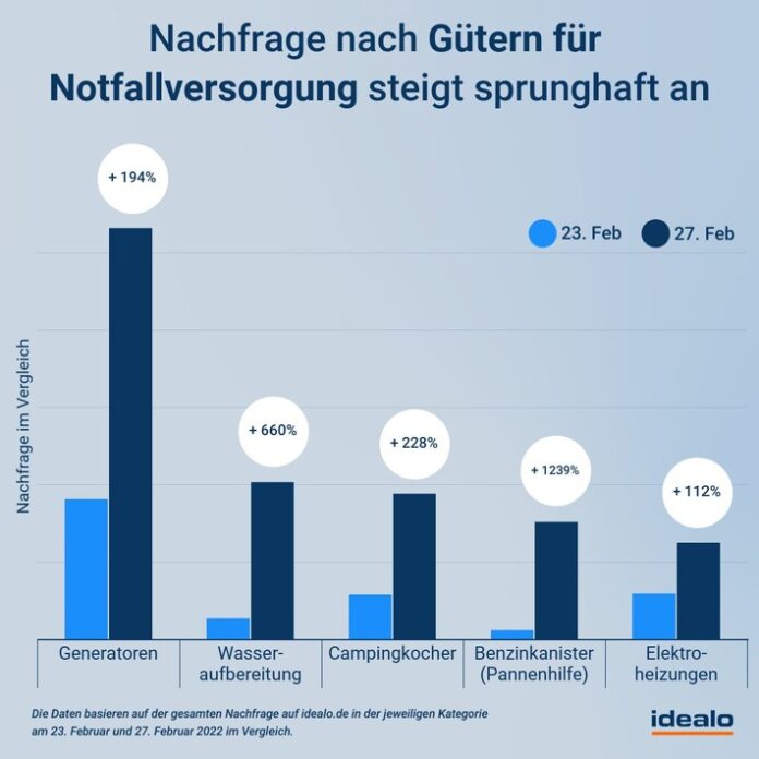 Wie eine Analyse der Preisvergleichsplattform idealo.de zeigt, ist seit Beginn des Krieges vor wenigen Tagen das Kaufinteresse an Bedarfsartikeln für Notfallsituationen sprunghaft angestiegen. So hat sich etwa die Nachfrage nach Notstromgeneratoren am vergangenen Donnerstag im Vergleich zum Vortag um 186 Prozent erhöht. Auch Elektroheizungen und Campingkocher sind seit einigen Tagen überdurchschnittlich gefragt. Nachdem das Interesse an diesen Produkten bereits am Donnerstag deutlich über dem normalen Niveau lag, ist es übers Wochenende nochmal merklich in die Höhe geklettert: Aktuell sind Elektroheizungen mehr als doppelt so gefragt wie vor dem russischen Einmarsch in die Ukraine – die Nachfrage nach Generatoren und Campingkochern ist mittlerweile sogar rund dreimal so hoch wie vor der Krise.
