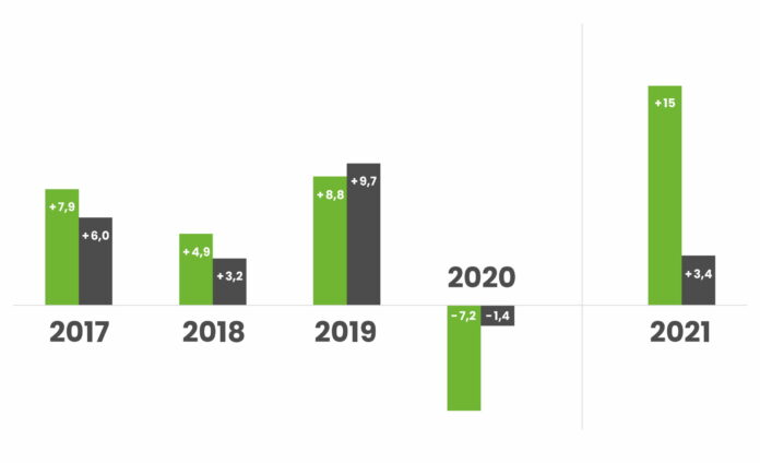 Auffallende Entwicklung in den Top 20: Beim Blick auf die Wachstumsquoten der Top 10 Agenturen fallen Oliver Schrott (+ 20,1 %), verbessert von Platz 8 auf Platz 5, und Edelman (+15,6 %), 7. Platz, auf. Beim Blick auf die Plätze 11 bis 20 – Honorarumsätze von 15,61 (MSL) bis 8,24 (segmenta) Millionen Euro – sticht die Berliner Agentur Piabo PR heraus, die sich im Vergleich zum Vorjahr um 100 Prozent gesteigert hat. Von 6,55 Millionen Euro PR-Honorarumsatz in 2020 steigerte sie sich auf 13,24 Millionen Euro im Jahr 2021. Damit kletterte sie von Platz 20 auf 12 und verzeichnet in dieser Gruppe den größten Zuwachs beim PR-Honorarumsatz.