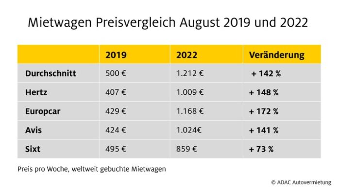 Bildrechte: ADAC Autovermietung: Mietwagenpreise im August 2022 weiter auf hohem Niveau/ Mietwagen bleiben knapp und teuer/ Durchschnittliche Wochenmiete beträgt heute 712 Euro mehr als 2019 / Mietwagen Preisvergleich August 2019 und 2022 / Weiterer Text über ots und www.presseportal.de/nr/122834 / Die Verwendung dieses Bildes ist für redaktionelle Zwecke unter Beachtung ggf. genannter Nutzungsbedingungen honorarfrei. Veröffentlichung bitte mit Bildrechte-Hinweis.