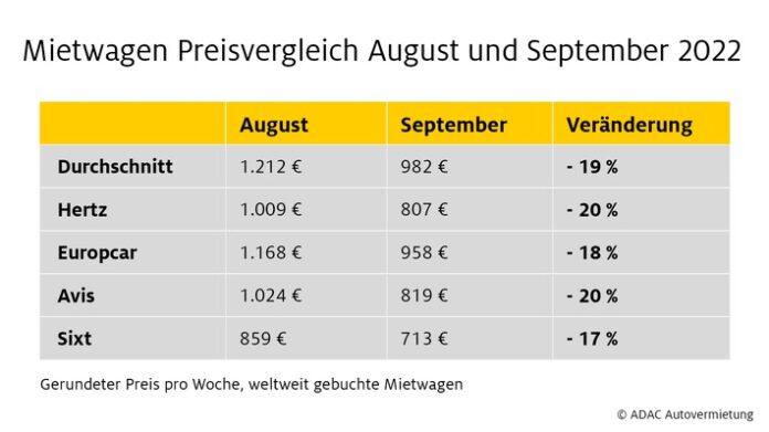 ADAC Autovermietung: Mietwagenpreise für Ferienregionen sinken im September um 19 Prozent / Durchschnittliche Wochenmiete für Ferienmietwagen im September 2022 beträgt 230 Euro weniger als im August