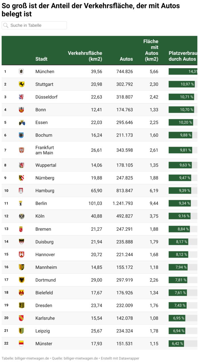 In München nehmen die privat gemeldeten Fahrzeuge 14,31 % der Verkehrsfläche ein. Damit ist München derzeit noch Spitzenreiterin. Die Landeshauptstadt ist jedoch sehr progressiv, was den Einsatz von neuen, geteilten Mobilitätsformen angeht und setzt damit dem privaten Pkw eine Alternative entgegen.