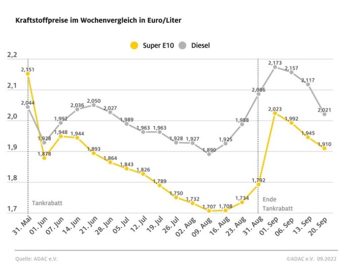 Auch der Benzinpreis ist binnen Wochenfrist gefallen, wenn auch in geringerem Maße. Laut ADAC kostet ein Liter Super E10 derzeit im Schnitt 1,910 Euro – ein Minus von 3,5 Cent.