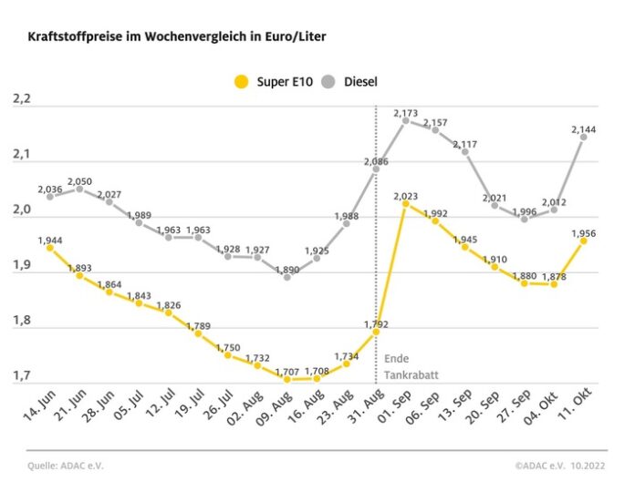 München – Die Entscheidung der Opec+-Staaten zur Reduzierung der Ölfördermenge am 5. Oktober hat eine Wende bei der Entwicklung der zuletzt sinkenden Kraftstoffpreise eingeläutet. Binnen einer Woche stieg der durchschnittliche Preis für einen Liter Diesel in Deutschland laut aktueller ADAC Auswertung um 13,2 Cent auf 2,144 Euro. E10 verteuerte sich im gleichen Zeitraum um rund 7,8 Cent auf 1,956 Euro je Liter.
