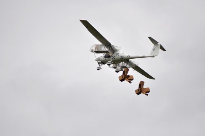 Flugzeug abgeworfen werden kann. Bei den Tests wurde eine Packung mit 30 Eiern