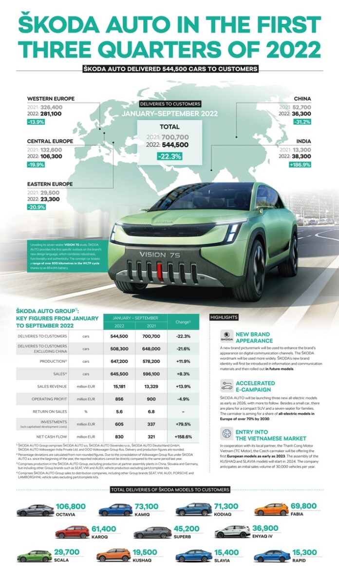 ŠKODA AUTO hat in den ersten drei Quartalen des Jahres 2022 trotz des herausfordernden Marktumfelds eine stabile Umsatzrendite von 5,6 Prozent und ein Operatives Ergebnis von 856 Millionen Euro (-4,9 % gegenüber Vorjahr) erzielt. Dies belegt, dass die Maßnahmen des konsequent weitergeführten Effizienzprogramms greifen. Aufgrund des hohen Auftragsbestands und stark steigender Auslieferungen auf dem wichtigen Wachstumsmarkt Indien (+186,9 %) rechnet ŠKODA AUTO auch für das Gesamtjahr mit einem positiven Operativen Ergebnis. Die Auslieferungen lagen von Januar bis September bei insgesamt 544.500 Fahrzeugen. Ursache für den Rückgang um 22,3 Prozent gegenüber Vorjahr ist die weiterhin angespannte Versorgungssituation aufgrund der globalen Ereignisse. Durch die Auswirkungen des Krieges in der Ukraine, die erheblich gestiegenen Rohstoff- und Energiepreise, den anhaltenden Halbleitermangel und instabile Lieferketten ist das Quartalsergebnis auch beim tschechischen Automobilhersteller stark belastet.