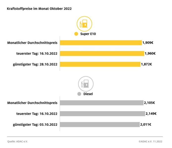 Die Preise für Benzin und Diesel haben sich im Oktober in entgegengesetzte Richtungen entwickelt. Wie die aktuelle ADAC Auswertung der Kraftstoffpreise in Deutschland zeigt, sank der Preis für einen Liter Super E10 im vergangenen Monat um 3,1 Cent gegenüber September und lag im Mittel bei 1,909 Euro. Anders beim Diesel: Ein Liter kostete im Monatsmittel 2,105 Euro – ein Plus von 2,7 Cent gegenüber dem Vormonat. Damit war der Dieselpreis im Oktober nur 3,5 Cent niedriger als im März 2022, dem bislang teuersten Tank-Monat aller Zeiten. Benzin hingegen kostete im Oktober 16 Cent weniger als im März.