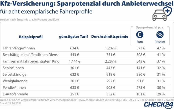 Kfz-Versicherung: Sparpotenzial durch Anbieterwechsel für acht exemplarische Fahrerprofile sortiert nach Ersparnis p. a. in Prozent und Euro Quelle: CHECK24 Vergleichsportal für Kfz-Versicherungen GmbH (www.check24.de/kfz-versicherung/; 089 – 24 24 12 12); Angaben ohne Gewähr; Stand: 28.10.2022 / Weiterer Text über ots und www.presseportal.de/nr/73164 / Die Verwendung dieses Bildes für redaktionelle Zwecke ist unter Beachtung aller mitgeteilten Nutzungsbedingungen zulässig und dann auch honorarfrei. Veröffentlichung ausschließlich mit Bildrechte-Hinweis.Bildrechte:CHECK24 Fotograf: CHECK24 GmbH