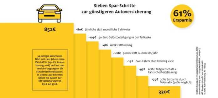 Die ADAC Autoversicherung hat für einen 34jährigen Autofahrer aus München die möglichen Einsparungen durch diese sieben Spartipps berechnet. Für den Fahrer eines VW Golf VII ergab sich dabei eine Ersparnis von 61 Prozent. Die Prämie für die Haftpflicht- und Teilkaskoversicherung sank von 852 Euro auf 330 Euro.