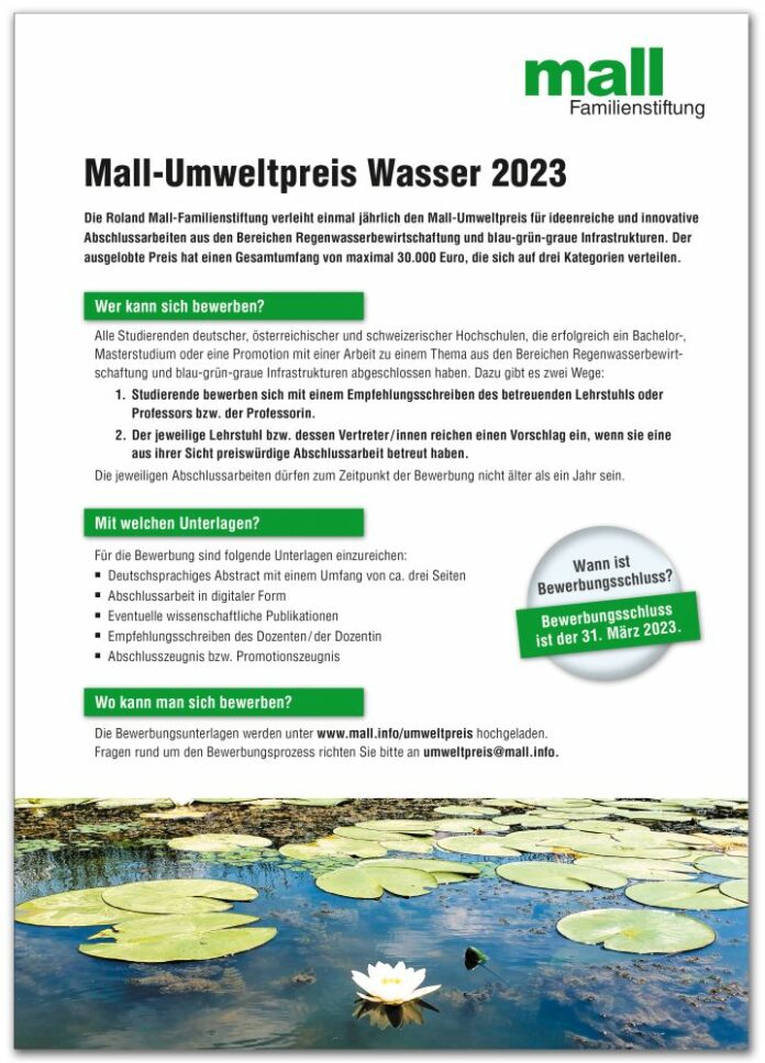 Die Roland Mall-Familienstiftung verleiht ab sofort einmal jährlich den Mall-Umweltpreis für ideenreiche und innovative Abschlussarbeiten aus den Bereichen Regenwasserbewirtschaftung und blau-grün-graue Infrastrukturen. Der ausgelobte Preis hat einen Gesamtumfang von maximal 30.000 Euro, die sich auf die Kategorien Bachelor-, Masterarbeiten und Dissertationen verteilen.