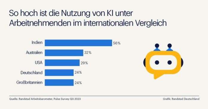 Durchschnittlich 33% der Arbeitnehmenden international nutzen aktuell künstliche Intelligenz in ihrem beruflichen Alltag. Zu diesem Ergebnis kommt der neueste Pulse Survey des Randstad Arbeitsbarometers (Q3/2023), in dem mehr als 7.000 Beschäftigte aus Deutschland, Großbritannien, USA, Australien und Indien befragt wurden. Während in Indien mehr als die Hälfte (56%) der Arbeitnehmer:innen bereits KI im Tagesgeschäft nutzen, sind es in Deutschland gerade mal 24%. Damit teilt sich die Bundesrepublik gemeinsam mit Großbritannien den letzten Platz. Australien (32%) und die USA (29%) liegen im Mittelfeld.