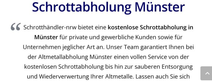Die Schrottabholung Münster bietet nicht nur eine einfache und bequeme Gratis-Abholung für Privatkunden, sondern auch einen umweltfreundlichen Service für gewerbliche Kunden. Termine können unter Schrottabholung Münster vereinbart werden.