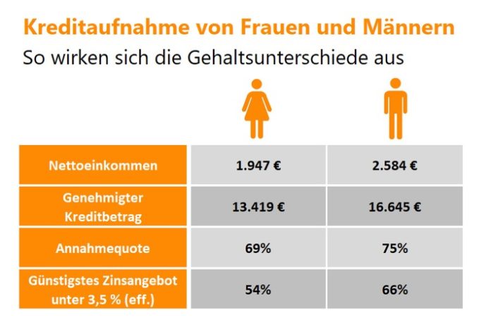 Wer weniger verdient, kann auch nicht so hohe Kredite aufnehmen: Die Darlehenssumme ist bei Frauen im Schnitt über 3.200 Euro niedriger als bei Männern. Und das ist nicht der einzige Unterschied.