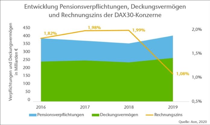 Mülheim a.d. Ruhr (ots) – Den DAX-Konzernen ist es im Jahr 2019 gelungen, die Belastungen durch Niedrigzinsen bei der betrieblichen Altersversorgung in den Bilanzen einzugrenzen. So lautet das Halbzeitergebnis der jährlichen Aon-Studie. Das Beratungs- und Dienstleistungsunternehmen hat bisher die Bilanzen von 15 der 30 DAX-Unternehmen analysiert.