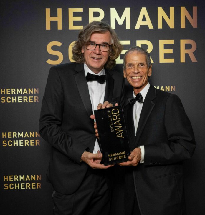 Foto: Hermann Scherer (l.), Jury-Vorsitzender des Speaker Slam und einer von Deutschlands Top-Rednern, übergibt den Excellence Award an Michael Tschugg.