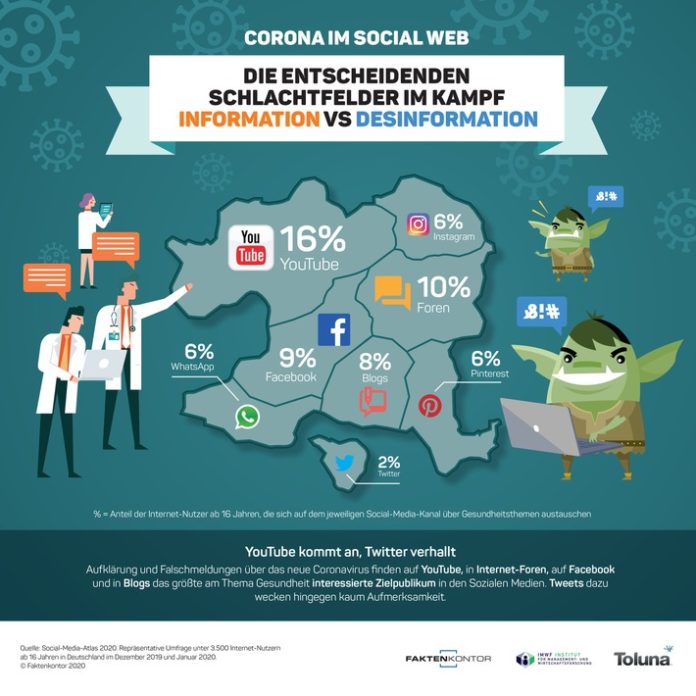 Gerüchte und Falschinformationen über das neue Coronavirus in den Sozialen Medien gefährden den Kampf gegen die schnelle Ausbreitung des Covid-19-Erregers und gefährden Menschenleben. Um gegenzusteuern, sollte die Aufklärung über Sars-CoV-2 im Social Web vor allem auf YouTube und in Internet-Foren erfolgen. Denn auf diesen Kanälen tauschen sich mehr Nutzer über Gesundheitsfragen aus als irgendwo sonst im Web 2.0. 16 Prozent aller Internet-Nutzer ab 16 Jahren in Deutschland befassen sich auf YouTube mit Gesundheitsthemen, und jeder zehnte nutzt dafür klassische Internet-Foren. Bemühungen über Twitter dürften in der Bundesrepublik hingegen weitgehend wirkungslos verpuffen. Das zeigen die aktuellen Zahlen über das Informationsverhalten von Internet-Nutzern in der Sozialen Medien aus dem aktuellen, repräsentativen Social-Media-Atlas 2020 der Hamburger Kommunikationsberatung Faktenkontor und des Marktforschers Toluna.