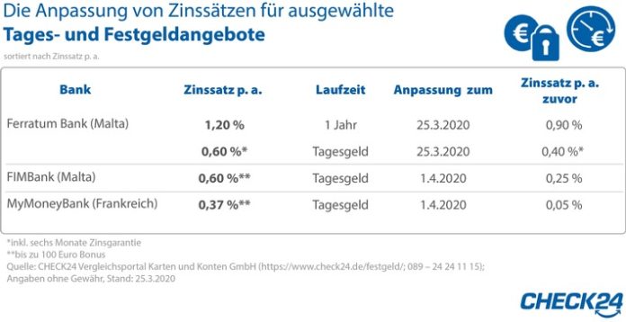 Durch die Corona-Krise steigen die Zinsen auf Tages- und Festgeld. „Für einige europäische Banken ist es aktuell günstiger, sich über Kunden- statt Unternehmenseinlagen zu finanzieren“ , sagt Rainer Gerhard, Geschäftsführer Karten und Konten bei CHECK24. „Deswegen haben sie zuletzt die Zinsen auf Tages- und Festgeld für Privatkunden deutlich erhöht.“