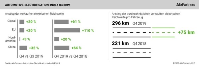 So fasst der aktuelle AlixPartners Automotive-Electrification-Index das Gesamtjahr 2019 zusammen. In der Studie ermittelt das global tätige Beratungsunternehmen quartalsweise die elektrische Reichweite, also die Summe der Reichweite aller verkauften E-Autos nach Ländern und Autoherstellern.