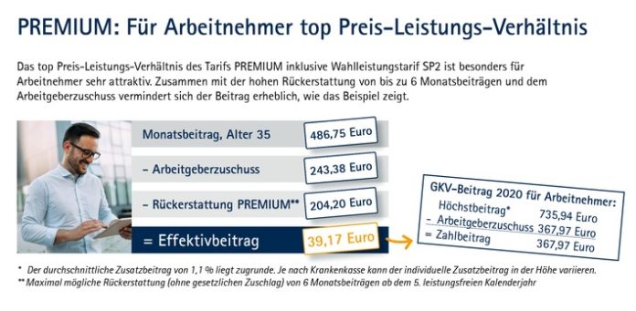 Neben starken Leistungen trumpft der neue Tarif mit einem sehr guten Preis-Leistungs-Verhältnis auf, das vor allem freiwillig gesetzlich versicherte Arbeitnehmer auf Anhieb überzeugt. Der PREMIUM-Beitrag für einen 35-Jährigen inklusive stationärer Wahlleistungen liegt abzüglich des Arbeitgeberanteils bei nur 243,37 Euro. Berücksichtigt man die maximale Rückerstattung von sechs Monatsbeiträgen, verbleiben gerade einmal 39,17 Euro im Monat. Zum Vergleich: Der freiwillig gesetzlich versicherte Arbeitnehmer zahlt abzüglich des Arbeitgeberanteils 367,97 Euro.