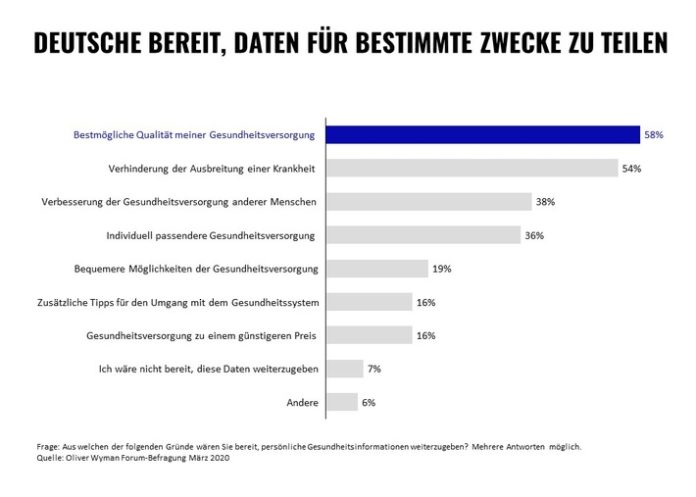 Dabei sind sich die Deutschen der Sensibilität ihrer Daten durchaus bewusst. „Nicht zuletzt hat die Einführung der DSGVO vor zwei Jahren dazu beigetragen, dass in Deutschland eine große Aufmerksamkeit für das Thema Datenschutz vorhanden ist“, sagt Kai Bender, Deutschland- und Österreichchef von Oliver Wyman. „Gleichzeitig wissen die Deutschen aber auch um den Wert der Daten und die Vorteile, die sich dadurch realisieren lassen.“ Das spiegelt sich auch in den Befragungsergebnissen: 58 Prozent der Befragten gaben an, ihre Gesundheitsdaten teilen zu wollen, um die bestmögliche Qualität ihrer Gesundheitsversorgung sicherzustellen, 54 Prozent um die Ausbreitung von Krankheiten in ihrer Umgebung einzudämmen.