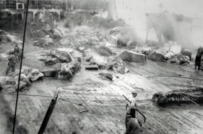 „Der Gestank ist mörderisch zwischen den Bergen von Innereien, die die Matrosen mit Schneeschiebern über die Kante schippen“, so schilderte ein Walfänger damals seine Erlebnisse. Die Meeresgiganten wurden auf den Fabrikschiffen noch vor Ort komplett verarbeitet. Das Oberdeck ein blutgetränktes Schlachtfeld.