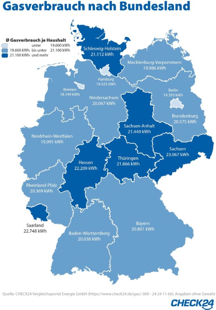 Im Mittel aller Bundesländer benötigen CHECK24-Kunden jährlich 20.284 kWh Gas.