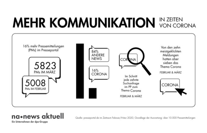 Hamburg (ots) – Das Kommunikationsbedürfnis deutscher Unternehmen nimmt in der aktuellen Corona-Krise zu. Im Vergleich zum Vormonat Februar stieg im März die Zahl der verbreiteten Pressemitteilungen um 16 Prozent an. Das Thema „Coronavirus“ bestimmt die Meldungen aber nur zum Teil. Dies ergab die Auswertung des Presseportals der dpa-Tochter news aktuell. Datenbasis waren über 10.000 Pressemitteilungen, die im Zeitraum 1. Februar bis 31. März 2020 auf presseportal.de veröffentlicht wurden.