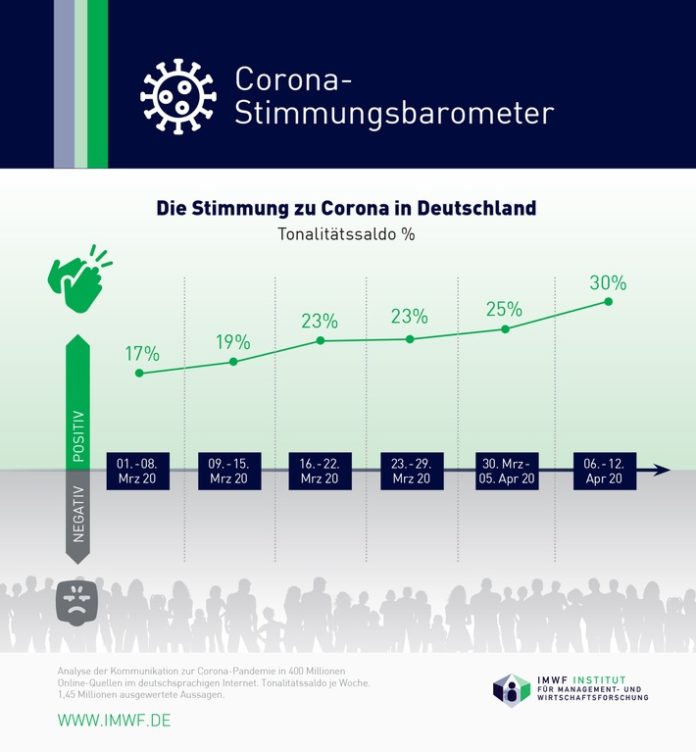 Hamburg (ots) – Die Bundesbürger schlagen sich tapfer in der Corona-Pandemie: Die Stimmung ist überwiegend positiv – und wird von Woche zu Woche immer noch ein bisschen besser. Das ergibt die Analyse von 1,45 Millionen Aussagen in den letzten sechs Wochen zu Corona im deutschsprachigen Internet, die das IMWF Institut für Management- und Wirtschaftsforschung durchgeführt hat.