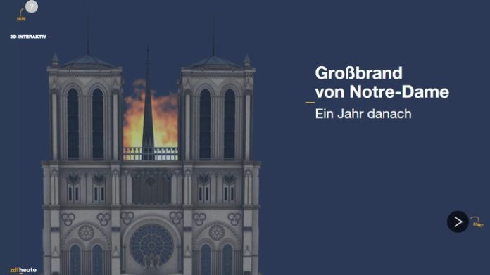 Mainz (ots) – Ein Jahr nach dem Großbrand von Notre-Dame zeigt ZDFheute ein interaktives 3D-Modell der Pariser Kathedrale. Die Grafik rekonstruiert den Ablauf der Katastrophe, die im April 2019 die ganze Welt bewegte. Nutzerinnen und Nutzer können durch das Modell navigieren und über Hotspots ergänzende Informationen abrufen; zusätzlich lässt sich die 3D-Kathedrale jederzeit frei drehen und vergrößern. Das Modell ist über die ZDFheute-App und auf ZDFheute.de abrufbar.
