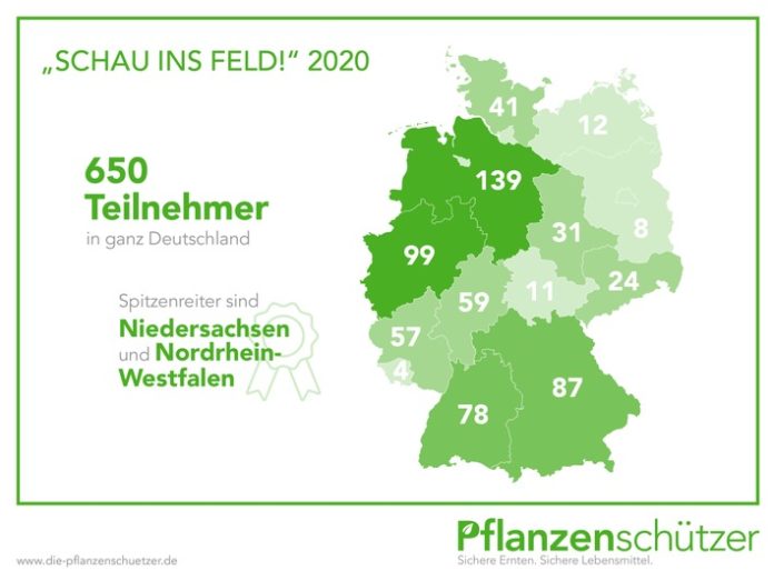 Verbraucher können die Entwicklung in den Schau!-Fenstern in ganz unterschiedlichen Kulturen begutachten: Stark vertreten sind Getreide, Mais, Zuckerrüben und Raps. Es gibt aber auch gekennzeichnete Nullparzellen im Wein-, Kartoffel- oder Sojaanbau sowie in verschiedensten Obst- und Gemüsekulturen. Die meisten Teilnehmer 2020 stammen aus Niedersachsen (139) und Nordrhein-Westfalen (99).