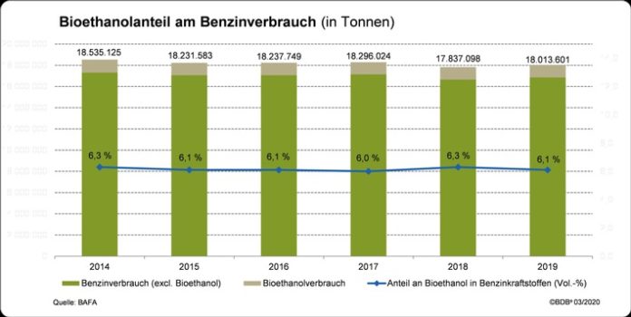 In einem 2019 insgesamt wieder leicht ansteigendem Kraftstoffmarkt, in dem mit 18,0 Millionen Tonnen etwa ein Prozent mehr Benzin abgesetzt wurde als im Vorjahr (2018: 17,8 Millionen Tonnen), verringerte sich der Verbrauch von Bioethanol, das den Benzinsorten Super E10, Super Plus und Super (E5) beigemischt bzw. zur Herstellung von ETBE (Ethyl-tertiär-butylether) verwendet wird, leicht auf knapp 1,16 Millionen Tonnen. Zur ETBE-Erzeugung wurden knapp 88.000 Tonnen Bioethanol und damit rund 20 Prozent weniger als im Vorjahr eingesetzt. Hingegen ist der Marktanteil der Benzinsorte Super E10 mit bis zu 10 Prozent Anteil Bioethanol von 12,9 Prozent auf 13,7 Prozent gestiegen. Die Absatzmenge betrug mit 2,46 Millionen Tonnen über 6 Prozent mehr als im Vorjahr (2018: 2,31 Millionen Tonnen).