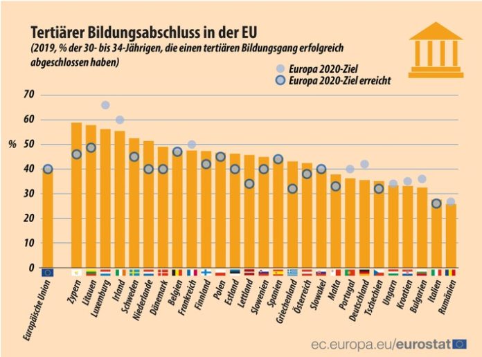 In Deutschland lag der Anteil der 30- bis 34-Jährigen mit tertiärem Bildungsabschluss im Jahr 2019 bei 35,5% (gegenüber 24,2% im 2002), der nationale Zielwert für 2020 ist 42,0%. Achtzehn Mitgliedstaaten haben bei diesem Indikator ihre nationalen Zielwerte für 2020 bereits erreicht oder übertroffen, nämlich Belgien, Tschechien, Dänemark, Estland, Griechenland, Spanien, Italien, Zypern, Lettland, Litauen, Malta, die Niederlande, Österreich, Polen, Slowenien, die Slowakei, Finnland und Schweden.