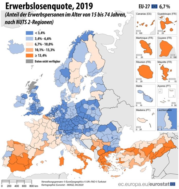 Erwerbslosenquoten in den Regionen der EU reichten von 1,3% bis 30,1% im Jahr 2019