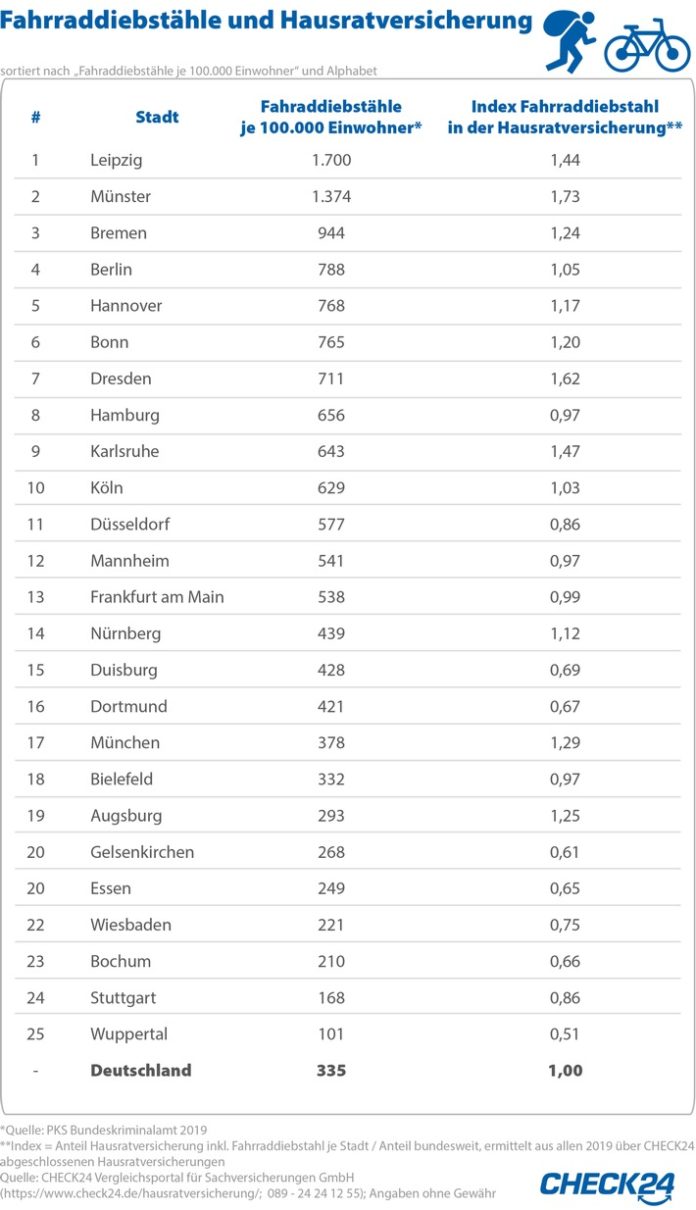 In Leipzig kamen im vergangenen Jahr 1.700 geklaute Räder auf 100.000 Einwohner – fünfmal so viele wie im Bundesdurchschnitt (335). In Münster waren es 1.374. Verbraucher sind darauf vorbereitet, denn sie sichern ihre Räder über die Hausratversicherung überdurchschnittlich häufig ab.