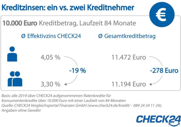 Ein Kreditnehmer, der ein Darlehen gemeinsam mit einer zweiten Person aufnimmt, erhält meist günstigere Konditionen. Der zweite Kreditnehmer verbesserte den zu zahlenden Zinssatz um 18,5 Prozent und verringerte die Zinskosten um 278 Euro über die gesamte Laufzeit.* Das zeigen aktuelle Zahlen des Vergleichsportals CHECK24.