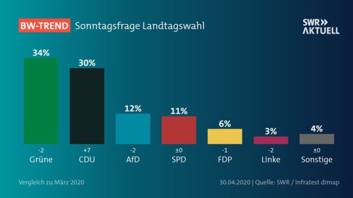 CDU legt kräftig zu, Grüne bleiben stärkste Kraft Wenn am Sonntag Landtagswahl wäre, würden die Christdemokraten im Südwesten gegenüber März um 7 Punkte zulegen und kämen auf 30 Prozent. Das ist der beste CDU-Sonntagsfragenwert im BW-Trend seit Februar 2016. Die Grünen würden im Vergleich zum Vormonat 2 Punkte abgeben, blieben mit 34 Prozent aber stärkste Kraft. Die SPD hätte unverändert 11 Prozent, die FDP läge bei 6 Prozent (-1). Auch die AfD tut sich in der Corona-Krise schwer. Sie würde 2 Prozentpunkte abgeben und käme auf 12 Prozent. Die Linke würde mit 3 Prozent (-2) an der Mandatsschwelle scheitern.