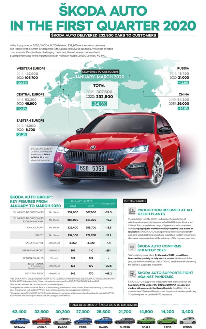 Die SKODA AUTO Group(1) hat im ersten Quartal 2020 einen Umsatz von 4,85 Milliarden Euro erzielt und liegt damit 1,4 Prozent unter dem Vorjahreswert. Das Operative Ergebnis erreicht einen Wert von 307 Millionen Euro und ist damit noch auf einem soliden Niveau, ebenso wie die operative Umsatzrendite mit 6,3 Prozent. Der Vergleich mit den Kennzahlen aus dem Rekordjahr 2019 verdeutlicht allerdings: Das Gesamtgeschäft von SKODA ist von der aktuellen wirtschaftlichen Situation und den notwendigen Maßnahmen gegen die weitere Ausbreitung der Covid-19-Pandemie empfindlich getroffen. Das zeigt der Blick auf die Auslieferungen: Von Januar bis März 2020 hat der tschechische Automobilhersteller weltweit 232.900 Fahrzeuge an Kunden ausgeliefert und liegt damit deutlich unter Vorjahr (erstes Quartal 2019: 307.600 Fahrzeuge; -24,3 %). Dennoch investiert das Unternehmen weiter konsequent in seine Zukunft und treibt die Transformation vom reinen Automobilhersteller zur ‚Simply Clever Company for Best Mobilty Solutions‘ entschlossen voran.