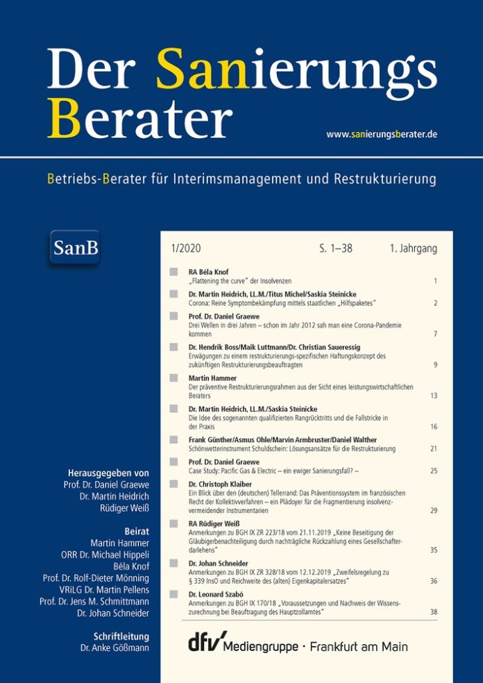„Als die erste Idee für eine dedizierte Fachzeitschrift mit dem Fokus auf Sanierung und Restrukturierung aufkam, waren wir überzeugt, dass das Thema an Fahrt aufnehmen und sich weiter vom klassischen Insolvenzrecht emanzipieren würde. Die Coronakrise wirkt diesbezüglich wie ein Katalysator; umso besser, dass der Sanierungsberater hier ab sofort online und offline wertvolle Unterstützung leisten kann. Wer ebenfalls daran mitarbeiten möchte, ist herzlich eingeladen“, so Prof. Dr. Graewe, einer der Herausgeber. Auch Dr. Heidrich, ebenfalls Herausgeber, sieht Potenzial in dem neuen Titel: „Das Geschäft mit der Krise ist in den letzten zwei Jahrzehnten immer hoffähiger geworden und wird seit Inkrafttreten des ESUG zunehmend durch Berater und Gläubiger bestimmt. Diese Entwicklung wird mit der Umsetzung der sogenannten EU-Restrukturierungs-Richtlinie noch weiter an Dynamik gewinnen. Hierdurch werden neue Kräfte und Ideen auf dem Sanierungsmarkt freigesetzt. Moderne Sanierungsberatung blickt nicht zurück – blickt stets nach vorne. Sie ist innovativ und interdisziplinär. Täglich entwickeln viele kluge Köpfe neue und smarte Sanierungsansätze. Mittlerweile etabliert sich ein regelrechtes Sanierungsrecht mit korrespondierender Sanierungs-Rechtsprechung. Die Zeitschrift fängt die vielen neuen Entwicklungen für den geneigten Leser ein, damit dieser mit der Dynamik in der Sanierungslandschaft Schritt halten kann.“