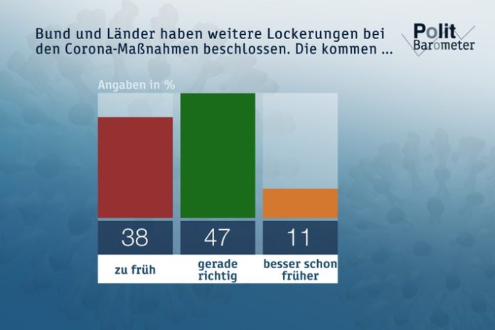 Besonders unterstützt werden die Lockerungen bei den Kontaktbeschränkungen: 67 Prozent bezeichnen sie als gerade richtig, 15 Prozent hätten sich das so schon früher gewünscht und 16 Prozent meinen, das komme zu früh. Dass die Bundesländer den Gastronomiebetrieben wie Restaurants und Cafés jetzt mit Einschränkungen erlauben, wieder zu öffnen, finden 52 Prozent richtig, 19 Prozent meinen, das hätte man besser schon früher machen sollen, und 26 Prozent denken, damit hätte man noch warten sollen.