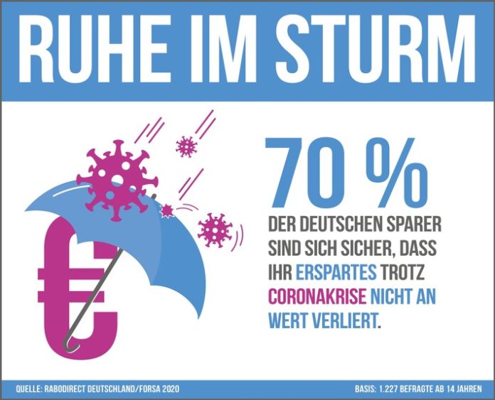 Seit Wochen steht das öffentliche Leben fast überall auf der Welt still. Auch we nn in Deutschland jetzt nach und nach Lockerungen möglich sind, werden die wirts chaftlichen und sozialen Folgen der Corona-Pandemie noch lange spürbar bleiben. Wie gehen die Deutschen in diesen Zeiten mit ihrem Geld um? Hat die Krise ihr Sp arverhalten beeinflusst? Und bekommen alternative Anlageformen eine neue Bedeutu ng? Fragen, die eine aktuelle forsa-Studie im Auftrag von RaboDirect beantwortet .