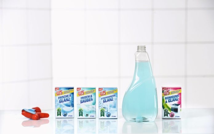 Anstatt leere Reinigerflaschen wegzuwerfen, können diese mit den „W5“-Reinigertabs für Glas-, Küchen-, Bad- oder Allzweckreiniger zu Hause ganz einfach neu mit qualitativ hochwertigem Reinigungsmittel befüllt werden. Durch die Wiederverwendung einer Reinigerflasche zusammen mit den praktischen Nachfülltabs kann jeder neues PET einsparen. Die Tabs sind zunächst testweise eine Woche lang in Aktion zum Preis von 1,49 Euro je Zweierpackung erhältlich.