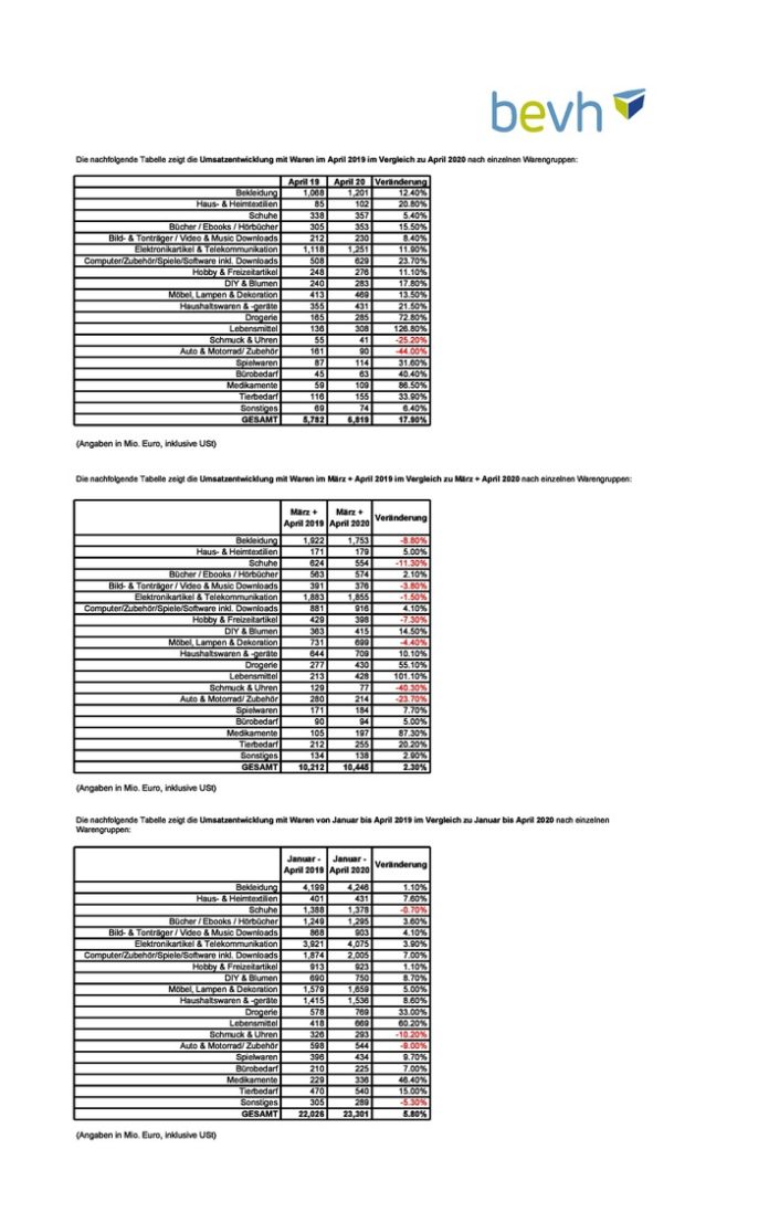 Umsatz im E-Commerce mit Waren, April 2019 vs. April 2020, Umsatz im E-Commerce mit Waren, März + April 2019 vs. März + April 2020, Umsatz im E-Commerce mit Waren, Januar – April 2019 vs. Januar – April 2020 sind separat als Anhang in der jpg-Datei aufgeführt.