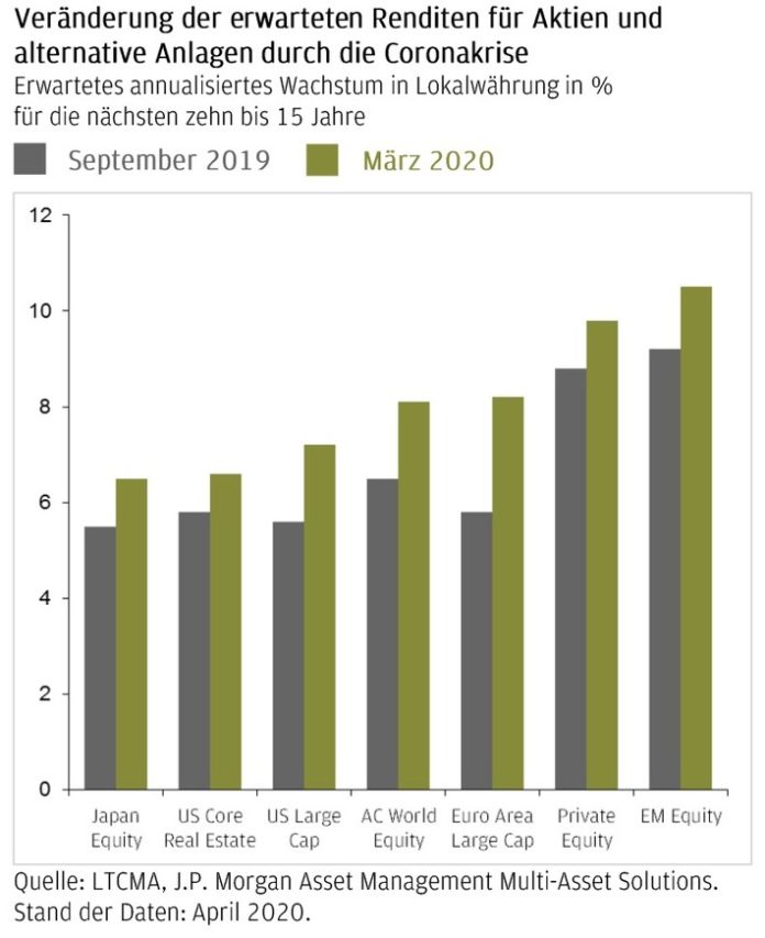 Diese und weitere Erkenntnisse bietet der überarbeitete langfristige Kapitalmarktausblick Long-Term Capital Market Assumptions (kurz LTCMA) von J.P. Morgan Asset Management. Dieses umfangreiche Werk mit Ertragserwartungen und Hintergrundanalysen für 50 Anlageklassen und Währungen erscheint seit gut einem Vierteljahrhundert jeweils zum Jahresende – aktuell wurden die Ertragserwartungen erstmals einer unterjährigen Neubewertung unterzogen. „Aufgrund des massiven Schocks, den COVID-19 an den Kapitalmärkten und in der gesamten Wirtschaft ausgelöst hat, haben wir untersucht, wie sich die drastischen Ausschläge der Anlagenpreise auf die langfristigen Ertragsaussichten und damit auf den Portfolioaufbau auswirken werden“, erläutert Tilmann Galler. Dabei wurde keine Änderung an den Annahmen selbst vorgenommen, sondern der Einstiegspreis der Anlageklassen vom 30. September 2019 auf den Preis vom 31. März 2020 aktualisiert. „Die globalen Aktienmärkte sind im Rekordtempo aus der Hausse in die Baisse umgeschwenkt und auch jetzt setzt sich die Marktvolatilität noch weiter fort. Da Marktneubewertungen bewegliche Ziele sind und bleiben, interessiert uns vor allem auch, wie sensibel die langfristigen Renditeprognosen auf die neuen Einstiegspreise reagieren“, führt der Experte aus. Auf dieser Basis ermittelt der Report für die wichtigsten Anlageklassen überarbeitete langfristige Ertragserwartungen für die nächsten zehn bis 15 Jahre.