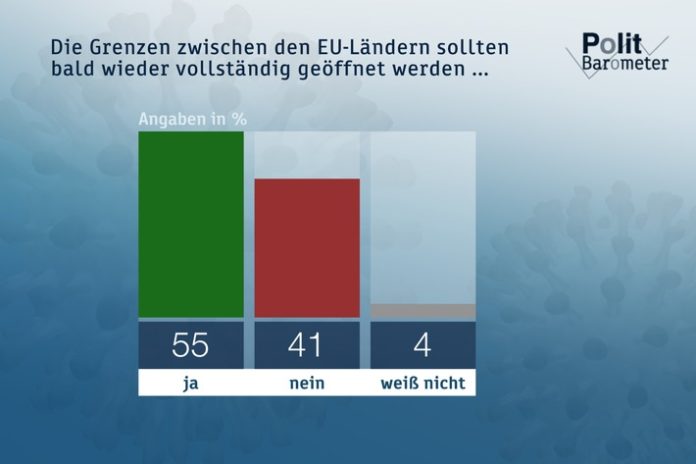 Mainz (ots) – Nach der bisherigen Planung will Bundesinnenminister Seehofer die Grenzen zu den meisten europäischen Nachbarländern nicht vor dem 15. Juni öffnen. Eine klare Mehrheit der Befragten (55 Prozent) wünscht sich allerdings schon bald eine vollständige Öffnung der Grenzen zwischen den Ländern der Europäischen Union, dagegen sind 41 Prozent (Rest zu 100 Prozent hier und im Folgenden jeweils „weiß nicht“). Von den Grenzöffnungen hängt für viele auch ab, was in der Urlaubssaison möglich ist. 51 Prozent geben dabei aktuell an, ihre Pläne für den Sommerurlaub würden durch die Corona-Krise beeinträchtigt. Bei 15 Prozent ist das nicht der Fall und 33 Prozent haben gar keine Pläne für einen Sommerurlaub.