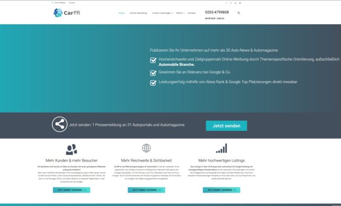 https://www.carpr.de/ | Mit Car PR werden Ihre Pressemitteilungen ausschließlich unter dem thematischen Bezug „Automarkt“ publiziert. Auf diese Weise wird Ihr Budget geschont und gleichzeitig das für Sie interessante Publikum erreicht. Für die Publikation stehen CarPR über 47 Auto-News & Premium Presseportale zur Verfügung, mit denen wir für Sie eine sehr hohe Sichtbarkeit erreichen und die Anzahl der Kontaktaufnahmen signifikant steigern können.